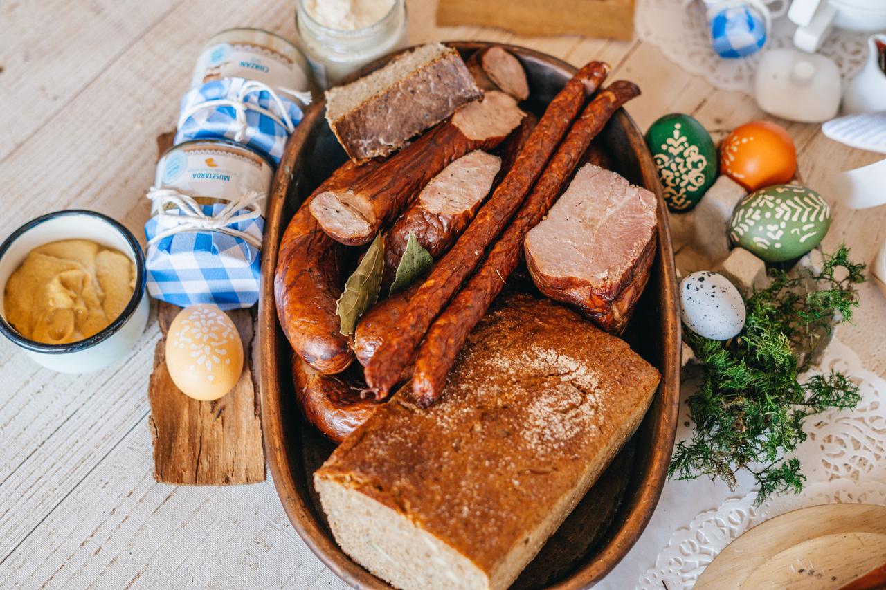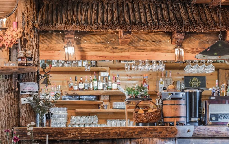 Sycące polskie dania w stylizowanej na drewnianą chatę restauracji z masywnymi belkami i drewnianymi stołami.