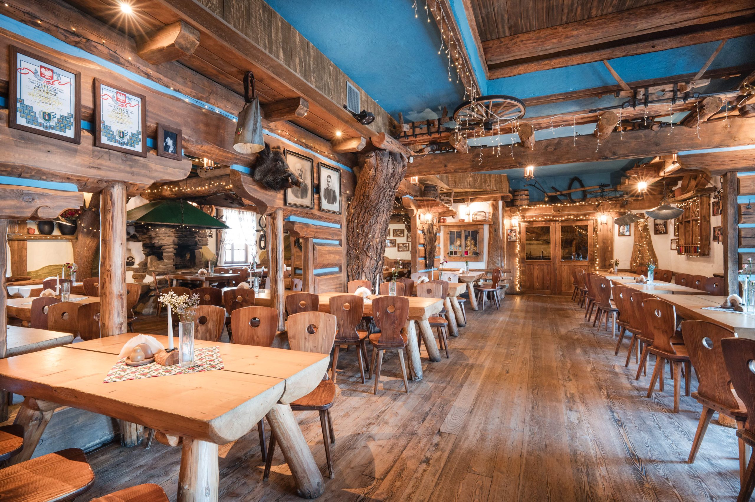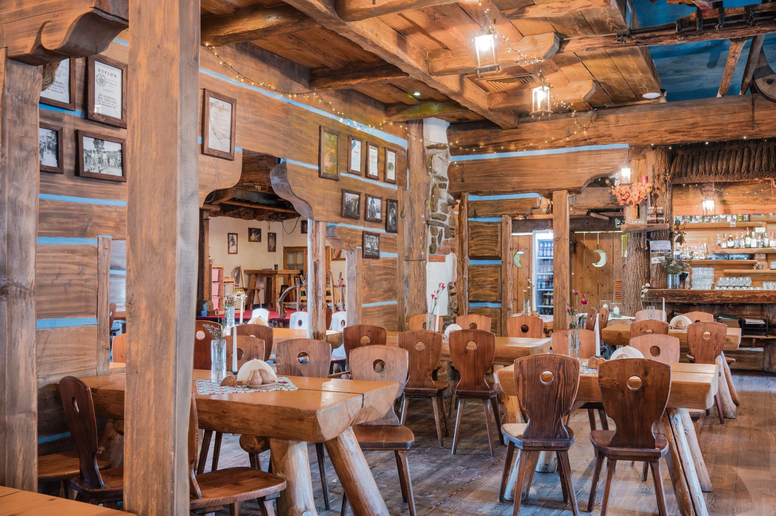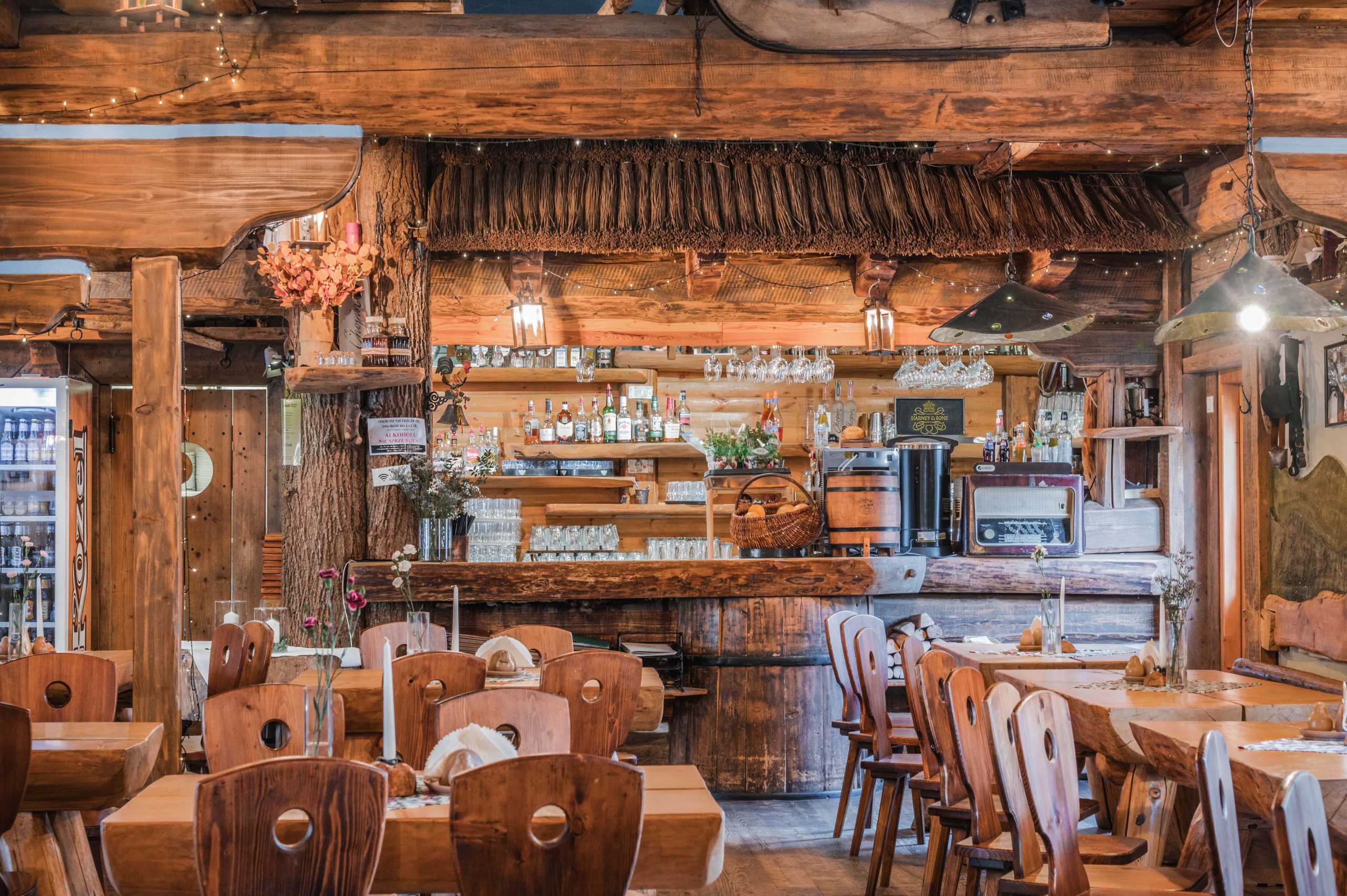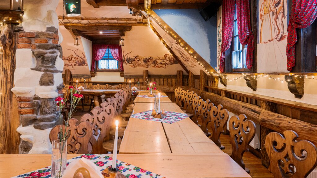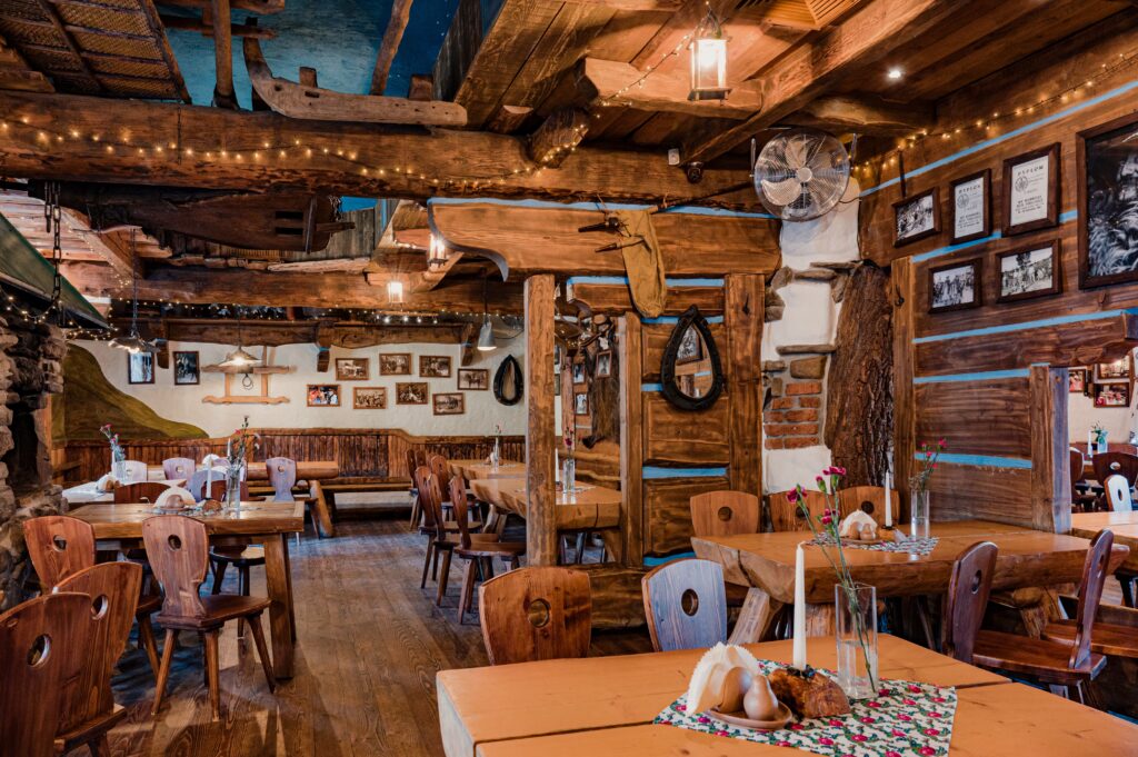 Sycące polskie dania w stylizowanej na drewnianą chatę restauracji z masywnymi belkami i drewnianymi stołami.