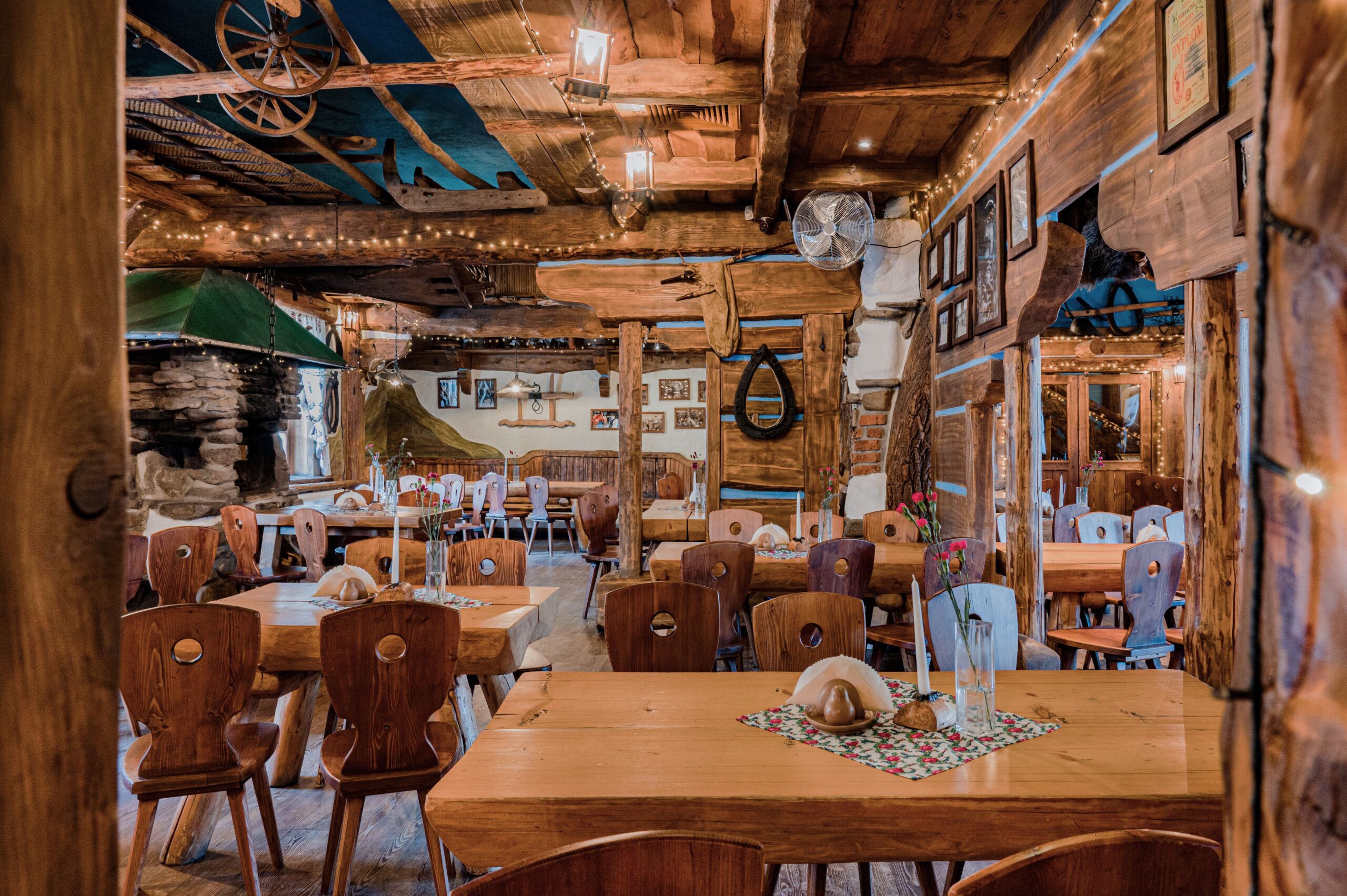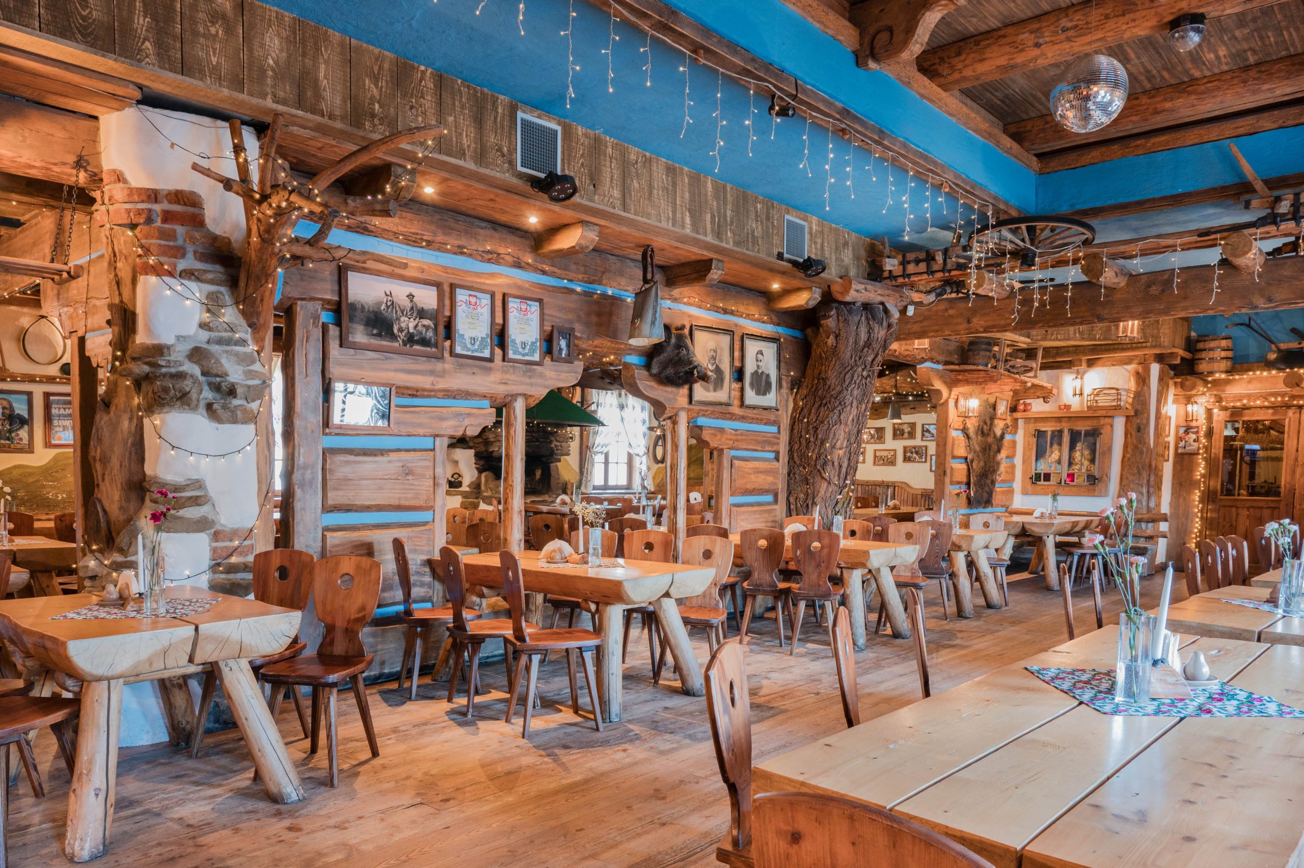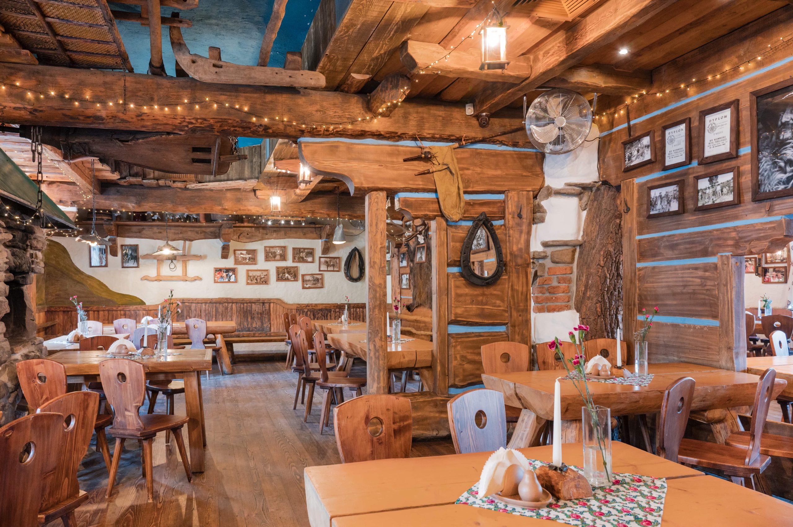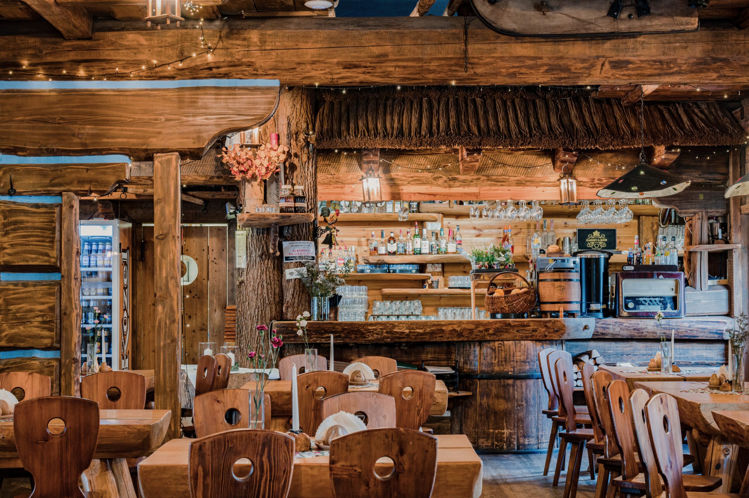 Sycące polskie dania w stylizowanej na drewnianą chatę restauracji z masywnymi belkami i drewnianymi stołami.