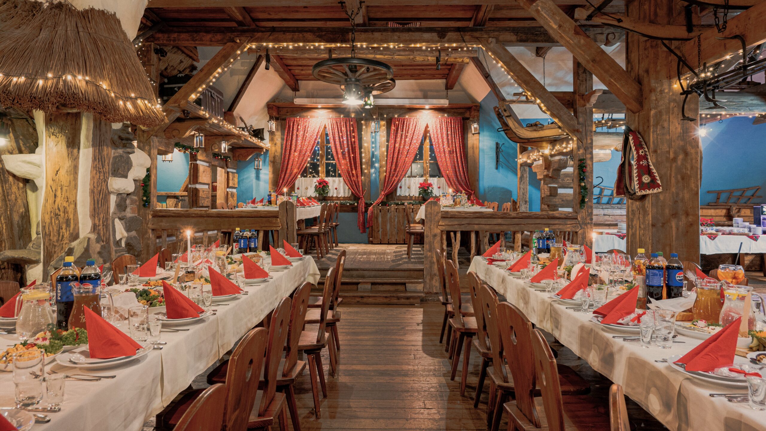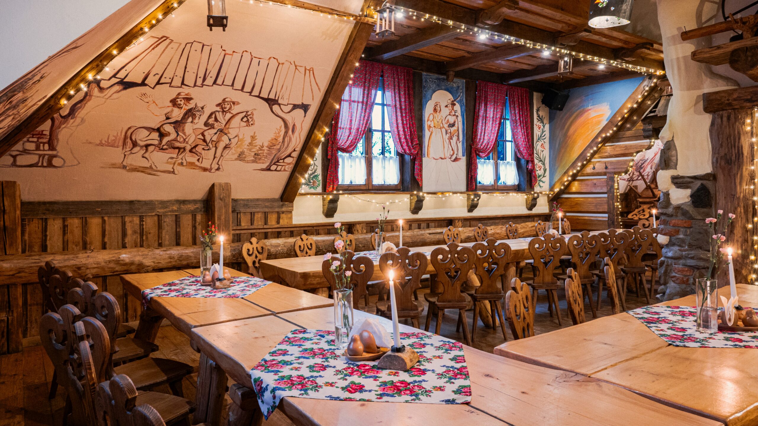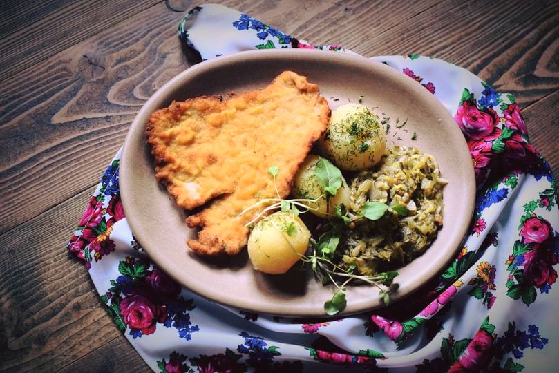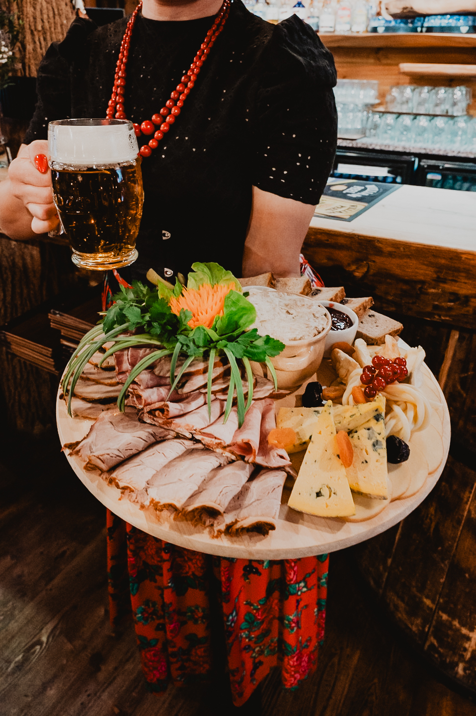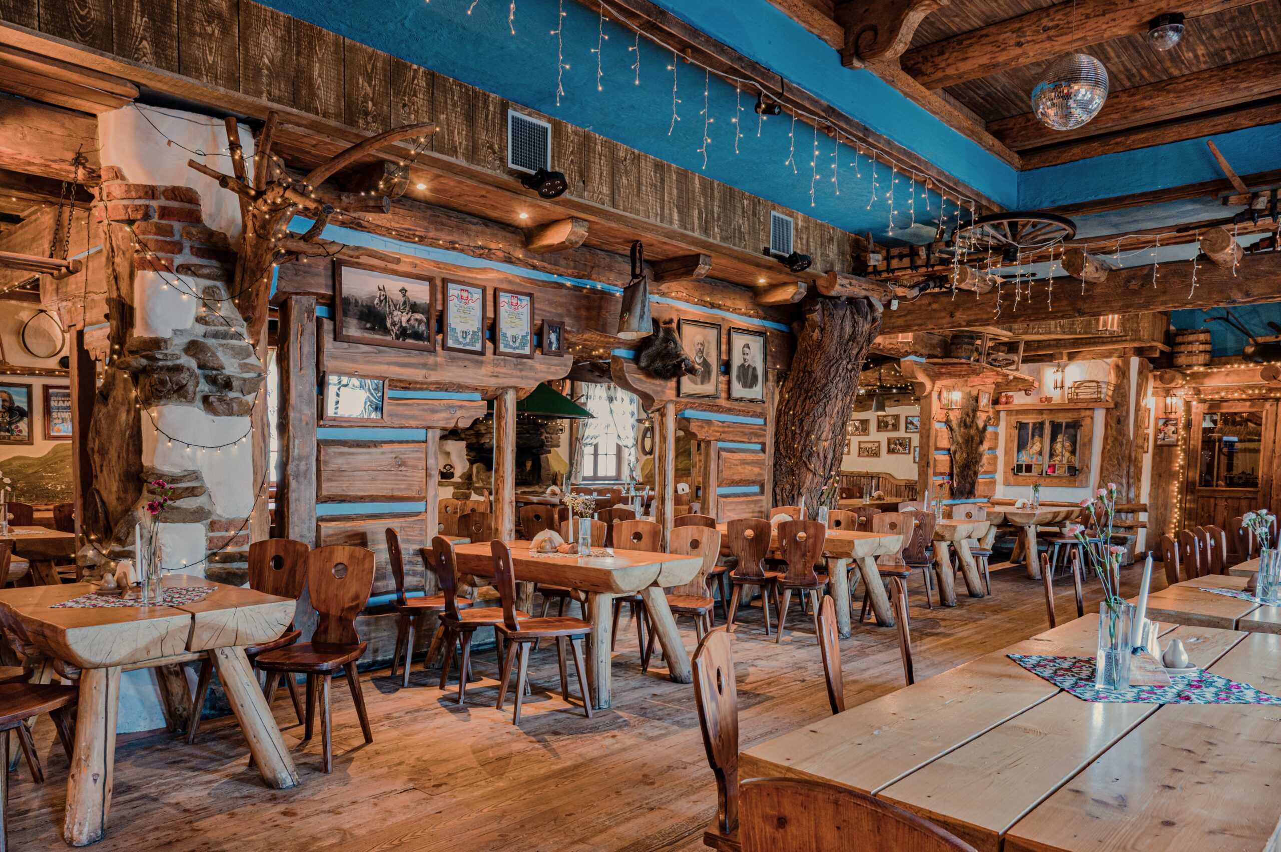 Sycące polskie dania w stylizowanej na drewnianą chatę restauracji z masywnymi belkami i drewnianymi stołami.