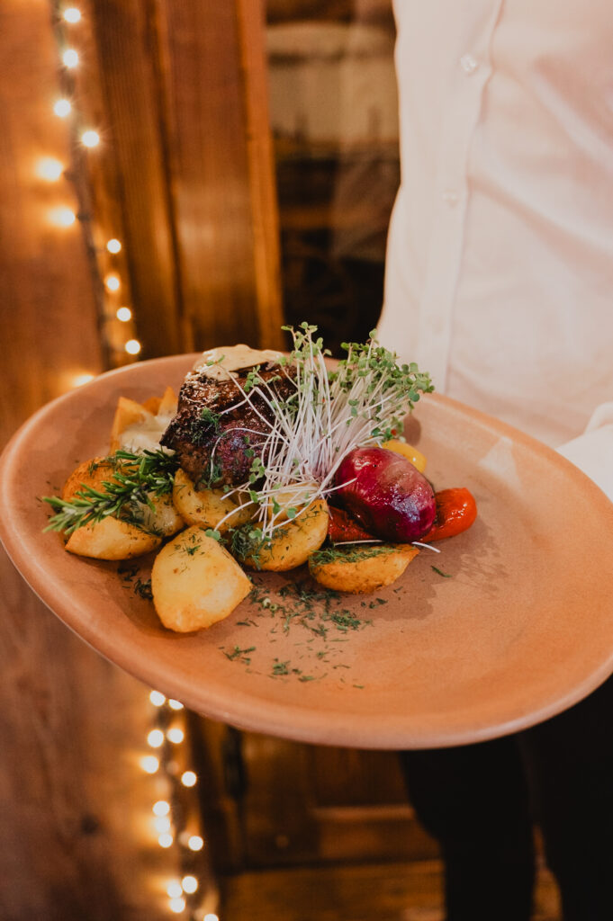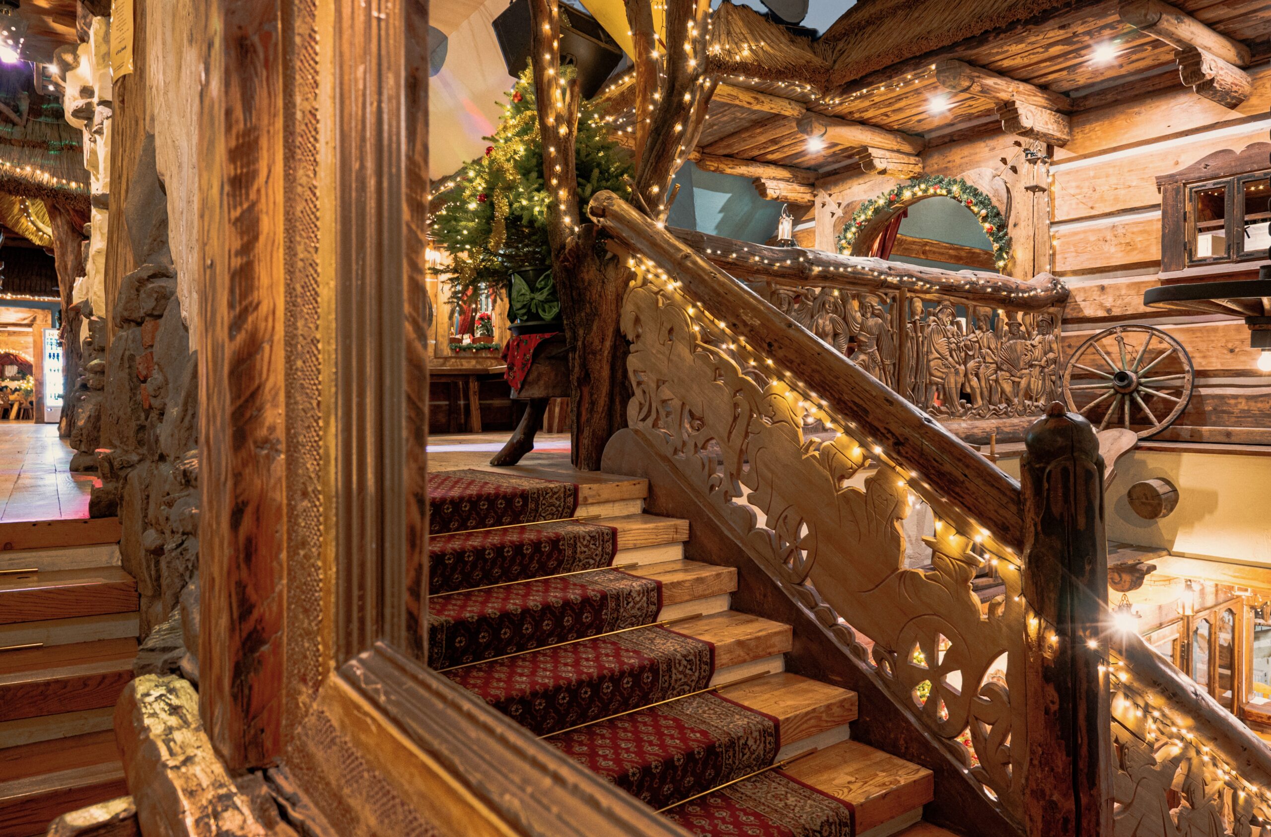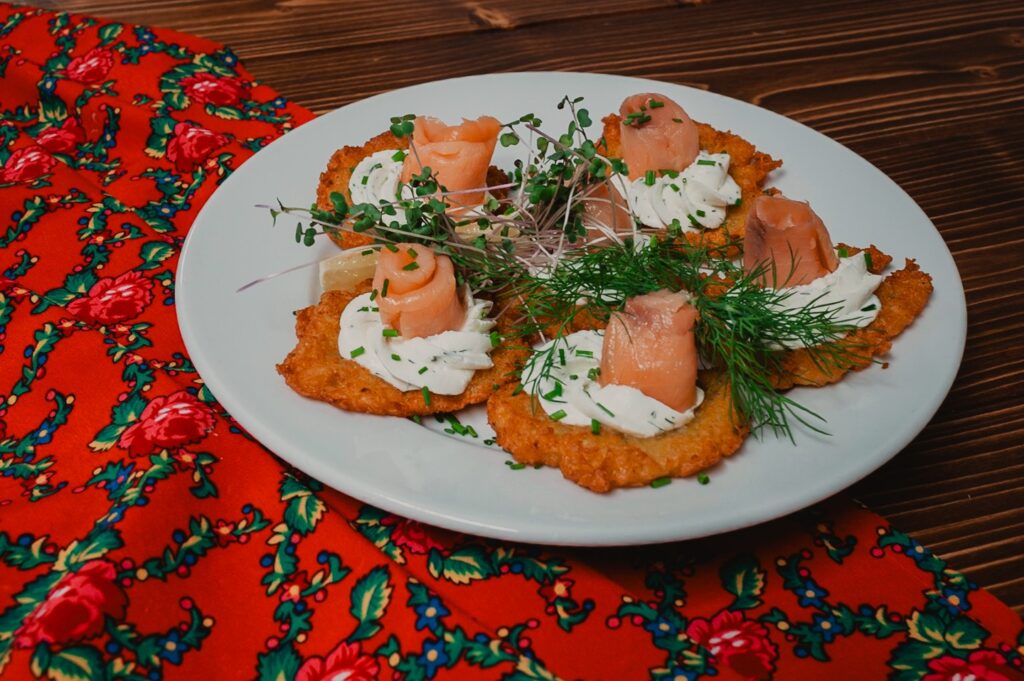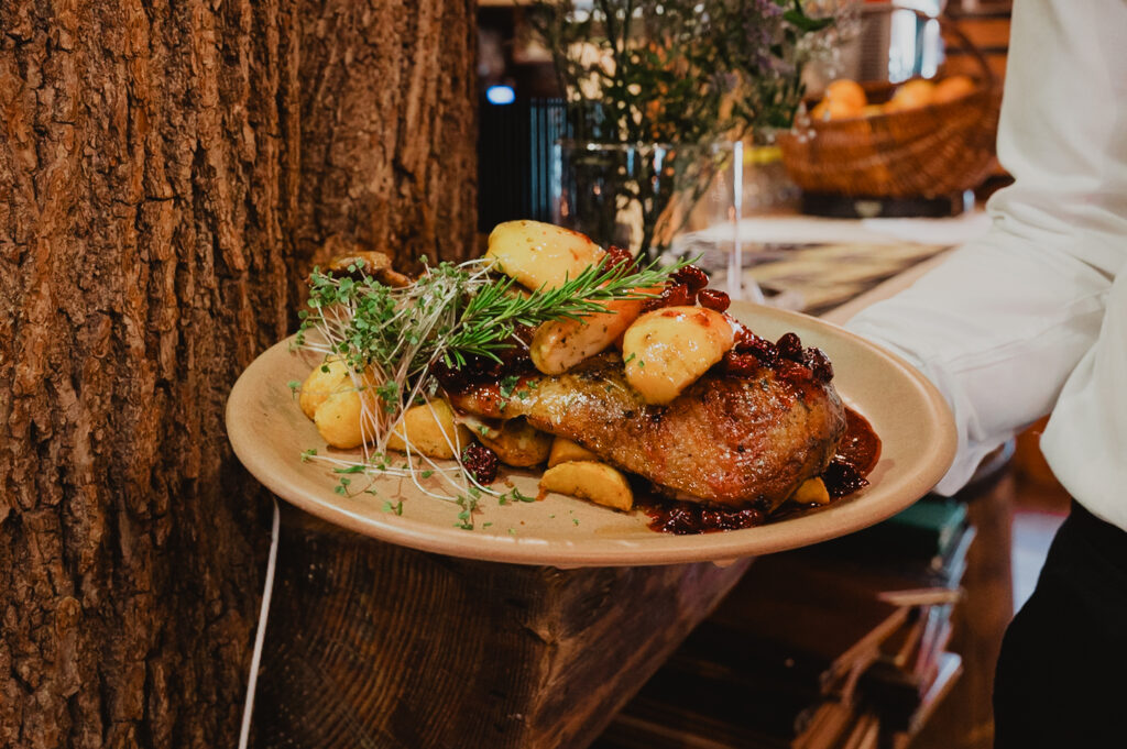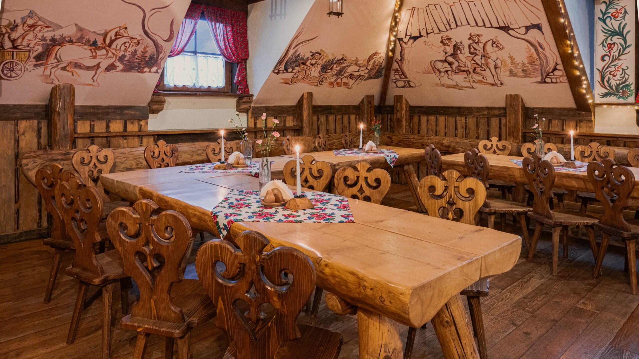Sycące polskie dania w stylizowanej na drewnianą chatę restauracji z masywnymi belkami i drewnianymi stołami.